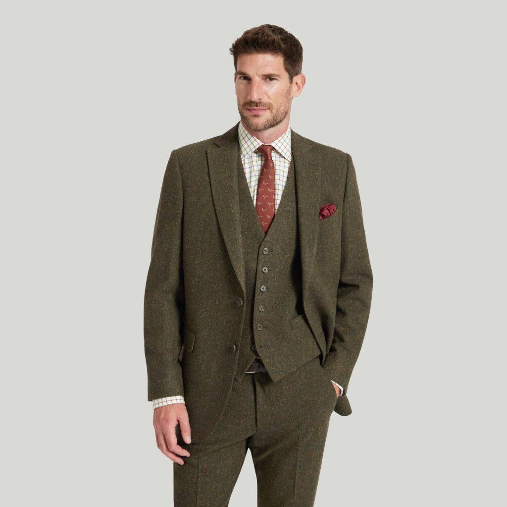 Suit: Green Donegal wool three-piece suit